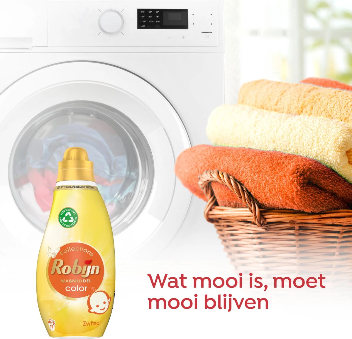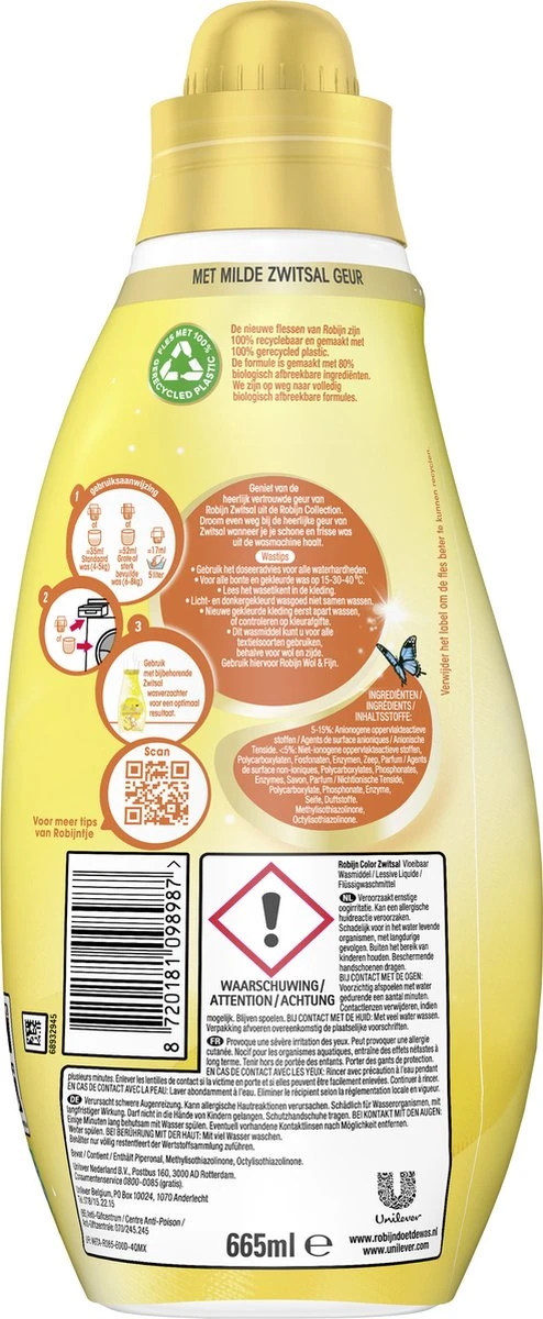 Robijn Klein & Krachtig Collections Color Zwitsal Vloeibaar Wasmiddel, met milde Zwitsal geur, heeft een unieke formule die speciaal is ontwikkeld voor de gekleurde en bonte was tot op 40 graden. Het wasmiddel zorgt ervoor dat je favoriete gekleurde en bonte kleding lang mooi blijft. Zo kun jij goed voor de dag komen. De verbeterde formule van Robijn Zwitsal bevat 80% biologisch afbreekbare ingrediënten. We zijn op weg naar volledig biologisch afbreekbare formules. De vertrouwde effectiviteit en bekende geuren van Robijn, gecombineerd met de kracht van de natuur. Goed voor je kleding en beter voor de planeet. Bovendien zijn de flessen gemaakt van 100% gerecycled en 100% recyclebaar plastic. Op deze manier draagt Robijn bij aan een duurzamere manier van wassen.