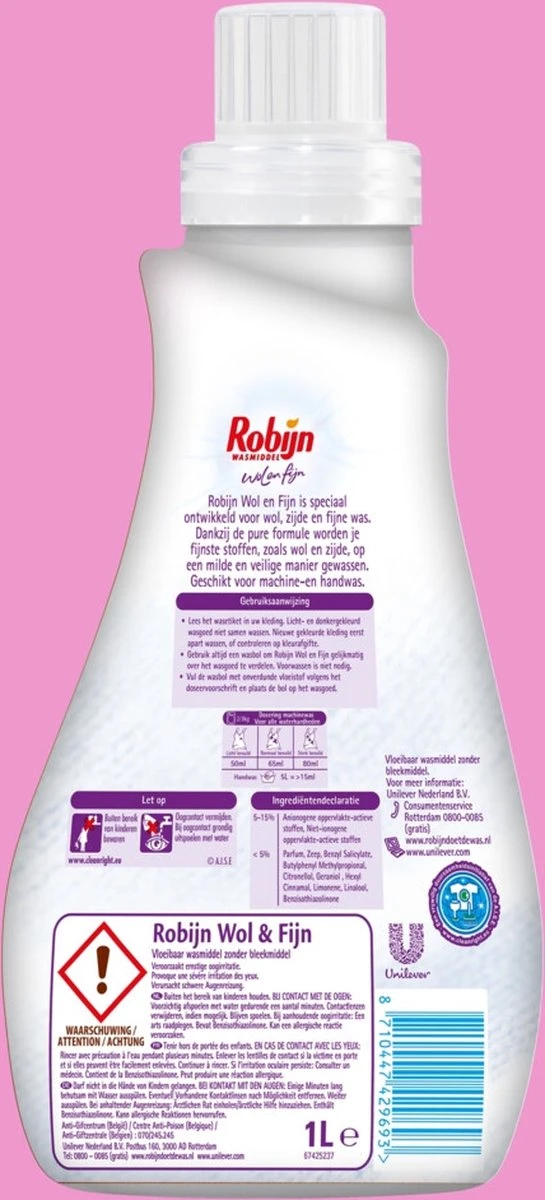 - Robijn Wol en Fijn vloeibaar wasmiddel is zacht voor fijne stoffen