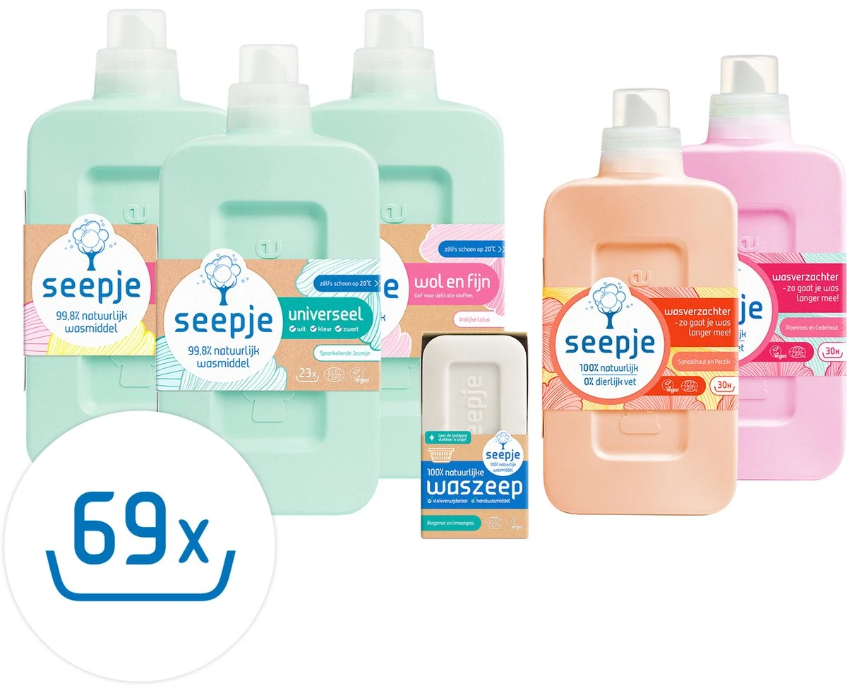 Seepje Wasfeest Pakket – 3 X Wasmiddel – 2 X Wasverzachter – Waszeep – Vlekkenverwijderaar – Natuurlijke Ingredienten – 69 Wasbeurten